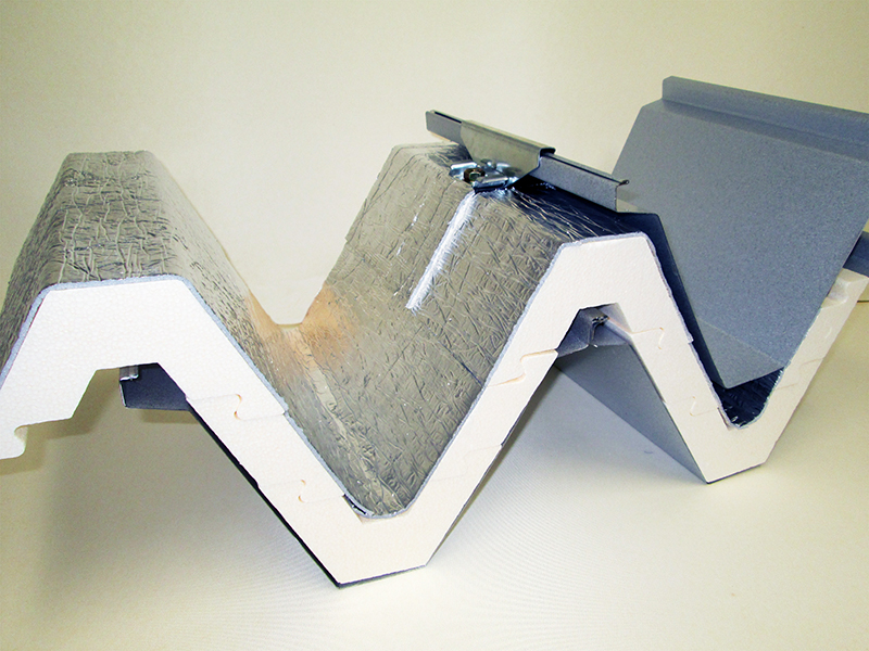 大型建造物に多い折板屋根に対応した、遮断熱材となります。従来からのカバールーフ工法時にSDNP-SYSTEMを設置する事で、折板屋根の遮断熱効果が飛躍的に高くなります。当社実験棟では夏の晴天時で、一般的な折板屋根と比べて天井表面(折板屋根の室内面)温度が最大で19℃低減されるという結果かが出ております。